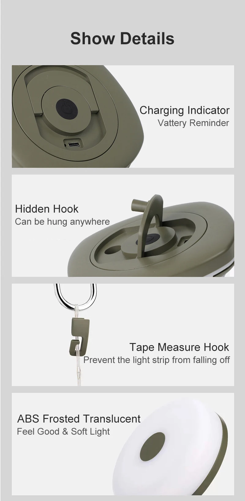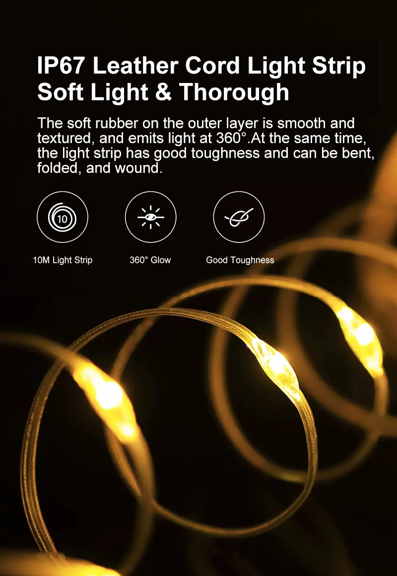 【Built to Last】The LED light strip, constructed with copper wire and transparent PVC material, offers a clear and 360-degree illumination. It is highly flexible, resistant to tangling, and can be easily bent. With an IPX4 waterproof rating, camping light string is ideal for various outdoor applications. The lamp's body is made of ABS with a matte, semi-transparent texture, ensuring a comfortable grip and creating a soft, diffused illumination.