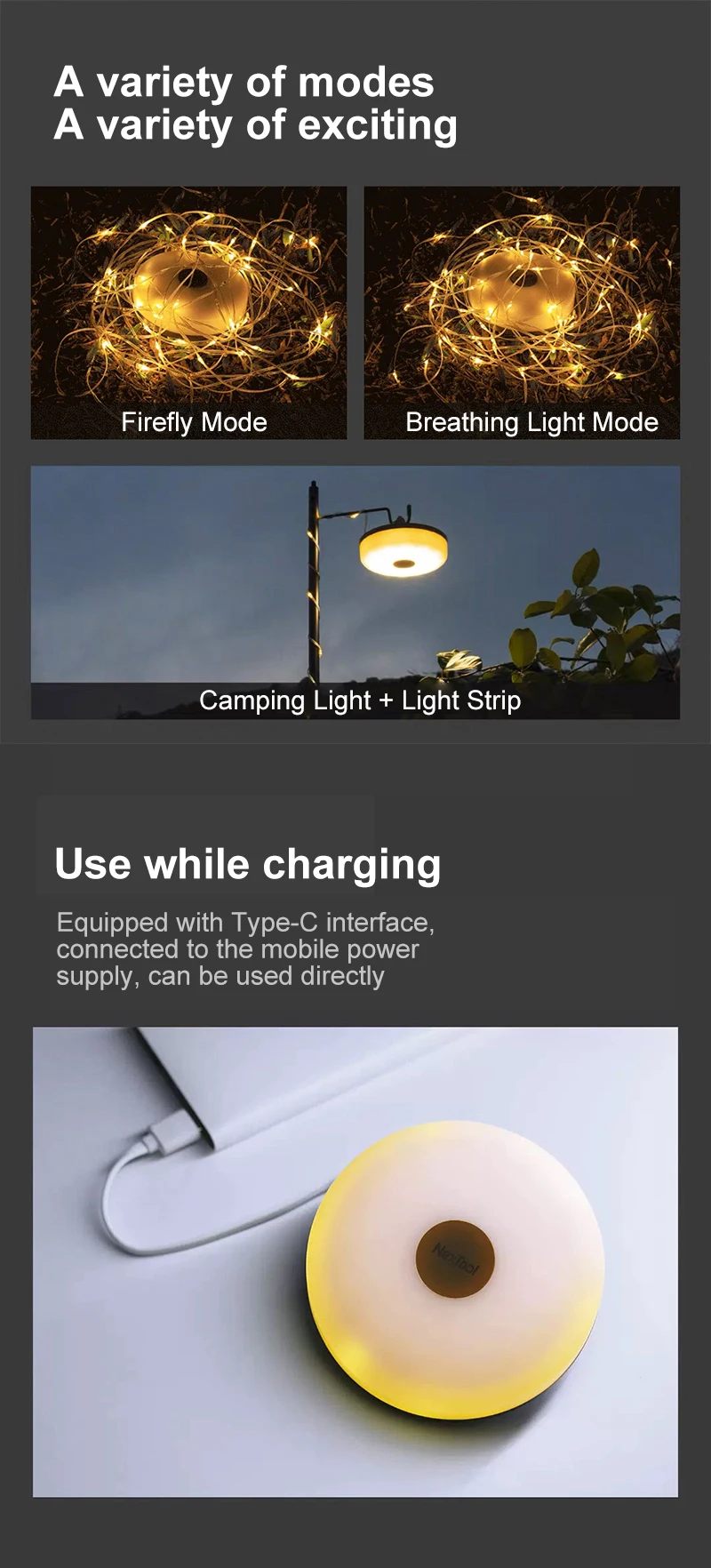 【USB Rechargeable】With its built-in 1500mAh battery, the outdoor string lights can operate for 3 to 7.5 hours when fully charged, depending on the selected mode. Rechargeable tent string lights can be used while charging, making it ideal for outdoor activities with the option to connect to a power bank.