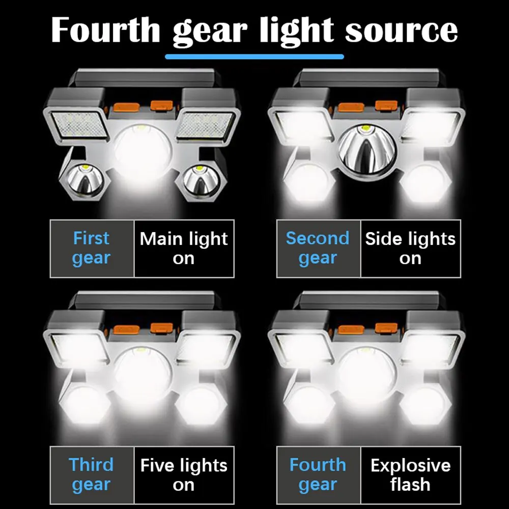 Led Five Head Headlight Strong Light Super Bright Headlamp USB Rechargeable Fishing Lamp Long Range Head Mounted Mine Flashlight