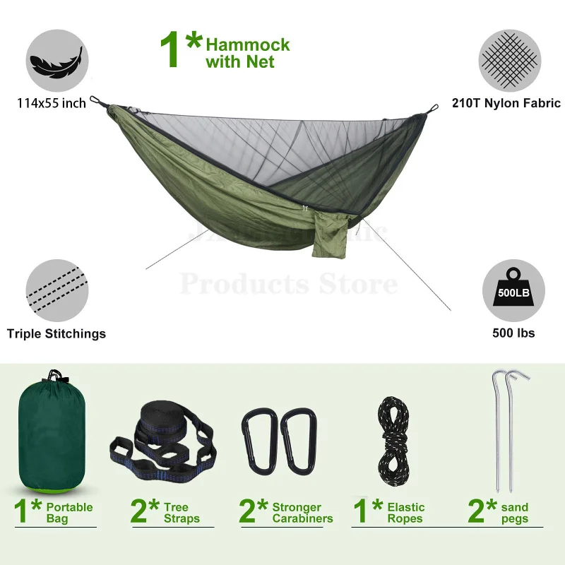 【Hammock With Convenient Net】- The net of the camping hammock is make out of durable material. Smaller the holes of the net, better the protection you get against bugs. One rope to set up, that means you do not need to waste your time setting up a net. To store mosquitoe net by putting the hook in the hole when you no need to be used the net. The inner bag can be used for storing small items.