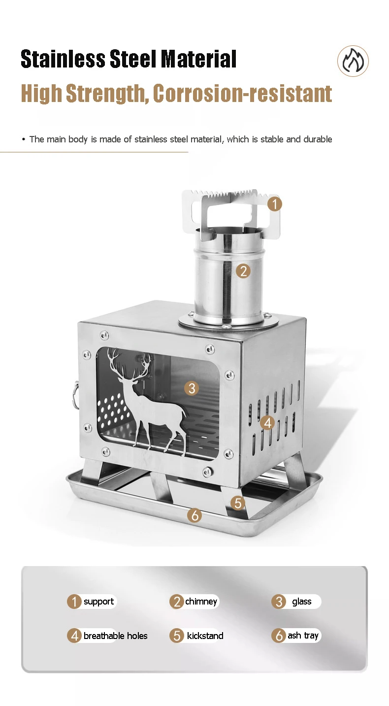 With a 304 stainless steel chimney, a 401 stainless iron ashtray, and a 201 stainless steel body, this stove is built to withstand high temperatures and maintain its performance. The 1200-degree quartz glass canopy provides added protection and enhances the overall functionality.