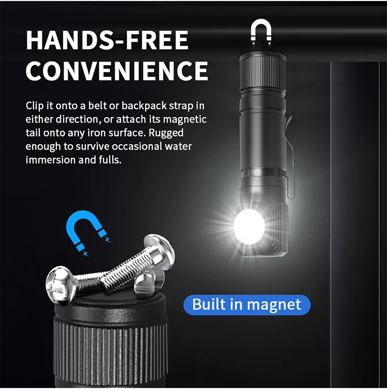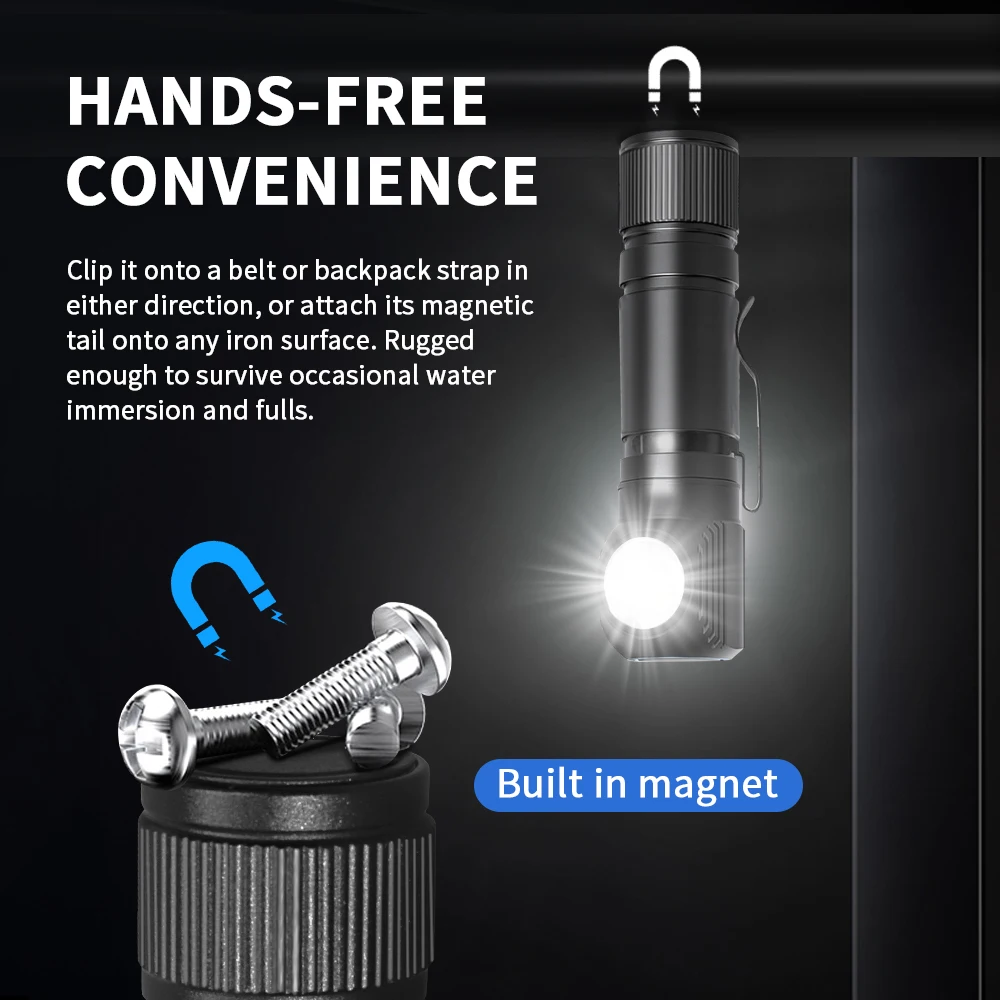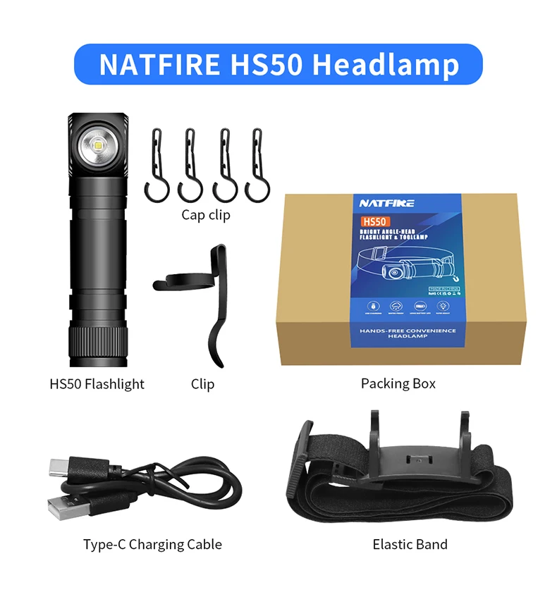 Natfire HS50 is a professional, bright angle-head flashlight and toollamp, designed for multiple indoor and outdoor activities like camping, hiking, fishing or hunting. With the supplied headband it can also be used as a headlamp. It is powered by a single 18650 lithium-ion rechargeable battery, is rechargeable via USB-C (Battery not includes, if needed, please choose the second option "with 3400mAh Battery") Moreover, HS50 comes with an adjustable elastic strap, a magnetic tailcap and 4 helmet clips for flexible and convenient one hand operation.