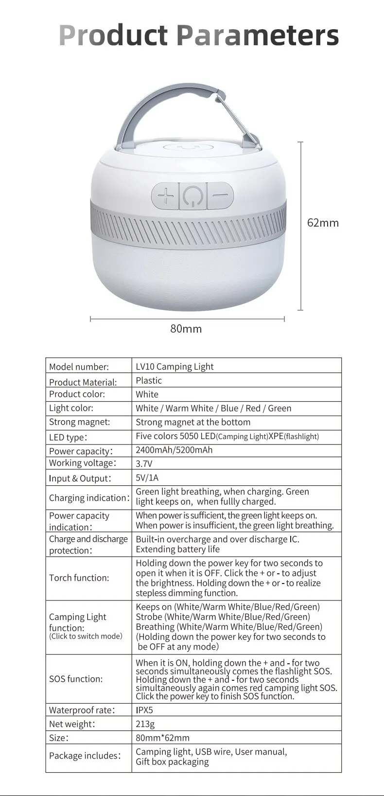 Rechargeable camping light & 5200 mAh power bank : Not only a portable camping lantern, but also a portable power bank that can be charged via a USB charging cable. Natfire LV10 lasts up to 80-230 hours under low brightness modes and will be perfect for your outdoor activities or home power outages.