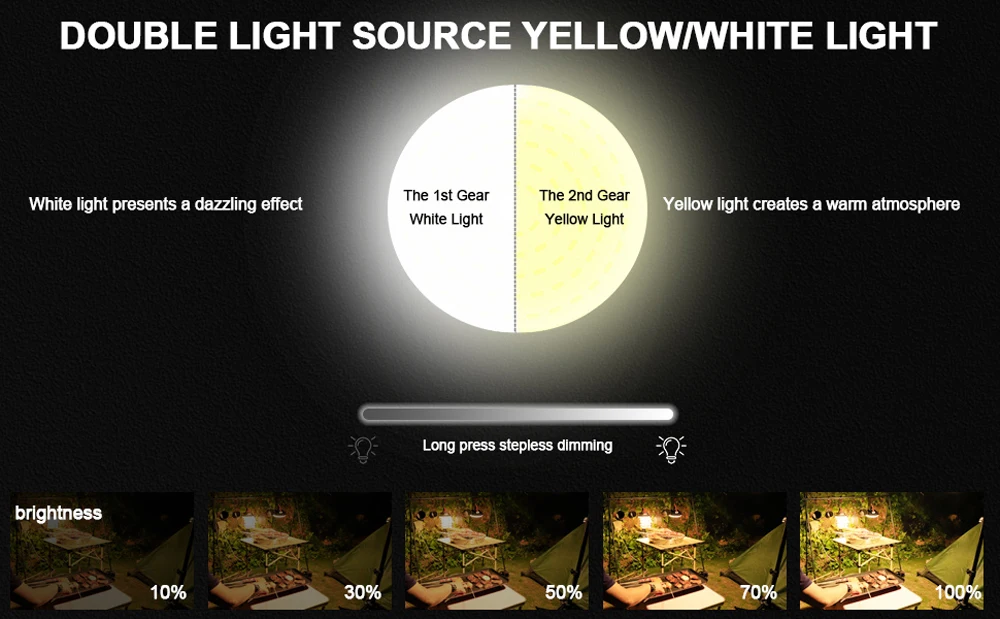 【2 Light Modes and Dimmable】Simply Long Press the switch of the tent light to adjust the brightness, While short press it can adjust the color to meet your need.