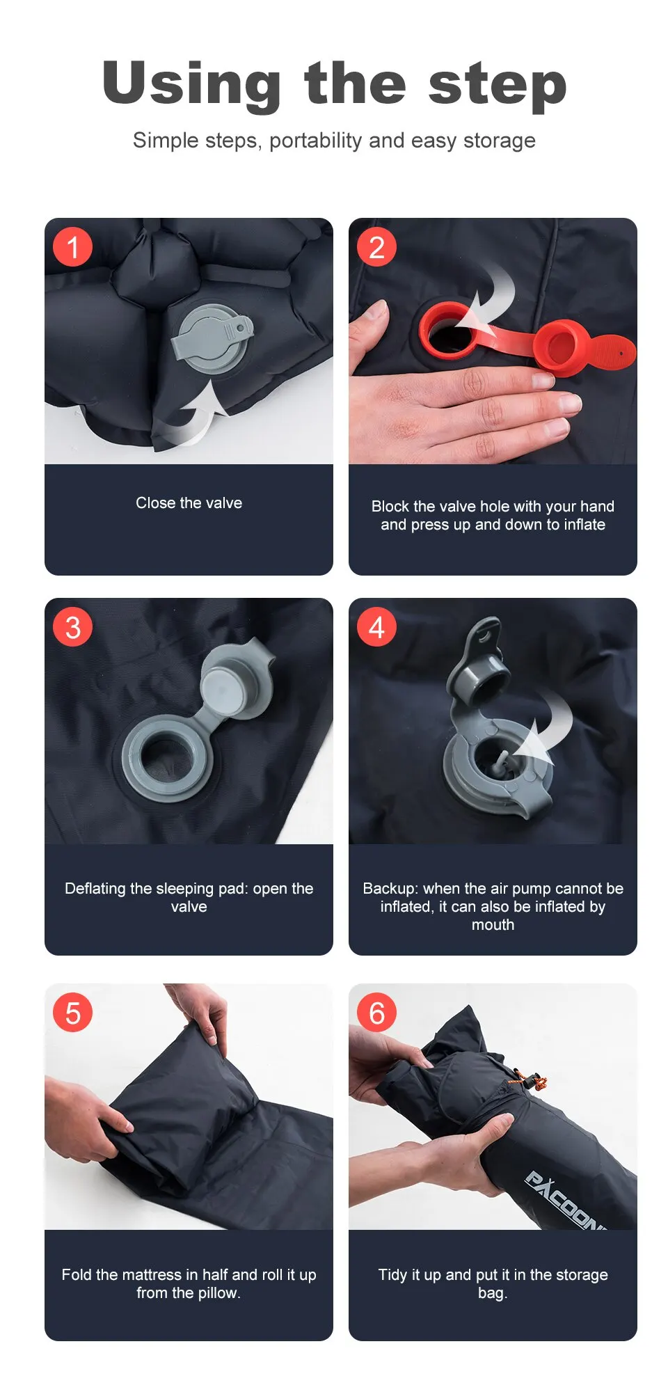 3.The sleeping pad folds down to about 27*10*10cm and weighs only about 600g. With a built-in air pump and pillow, no need to carry extra pillow. Once deflated and folded, the camping pad fits easily in your pack, and it’s super lightweight and space-saving, leaving plenty of room for other equipment