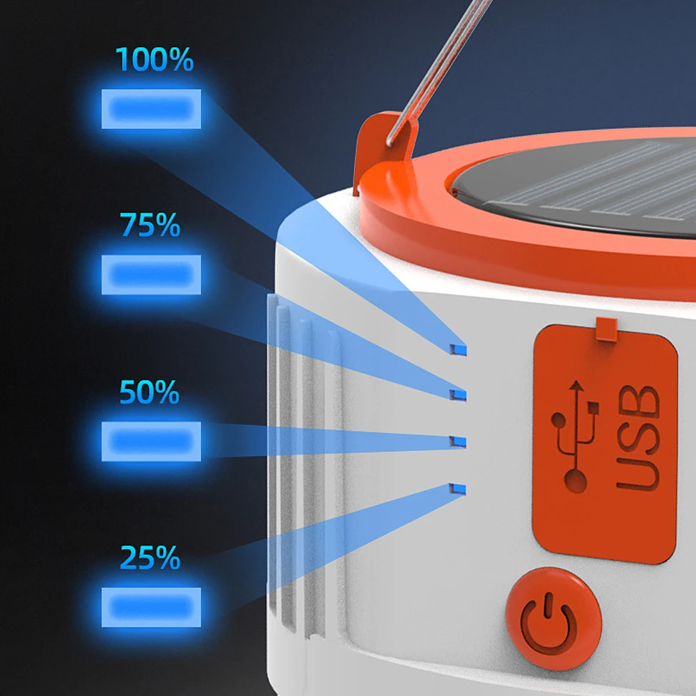 This portable lamp is combined solar outdoor camping light with home quality desk lamp, practical and useful. Hook design, do not need installation, foldable design, easy to fold. Uniform and soft emission light, support 360° lighting and not dazzling. 4 gears real time electric quantity display, easy to know the working status and with charge indicator light function. There are two types optional, USB in only and USB in-and-out, you can choose according to your demands. You can have a try.