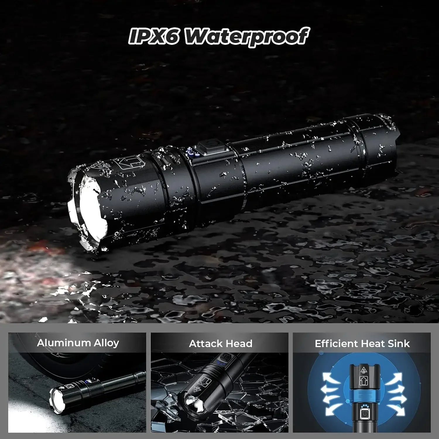 【WATER RESISTANT & HEAVY DUTY FLASHLIGHT】: This IPX6 waterproof tactical flashlight is developed for rough handling and can withstand a fall of 5m or be temporarily submerged under water. flashlight can even be frozen, run over by a truck, and it still works! suitable for outdoor use, such as camping, adventure, hiking, fishing, but please Do not immerse this mountaineering flashlight directly in water or discard the dust cover of the charging port
