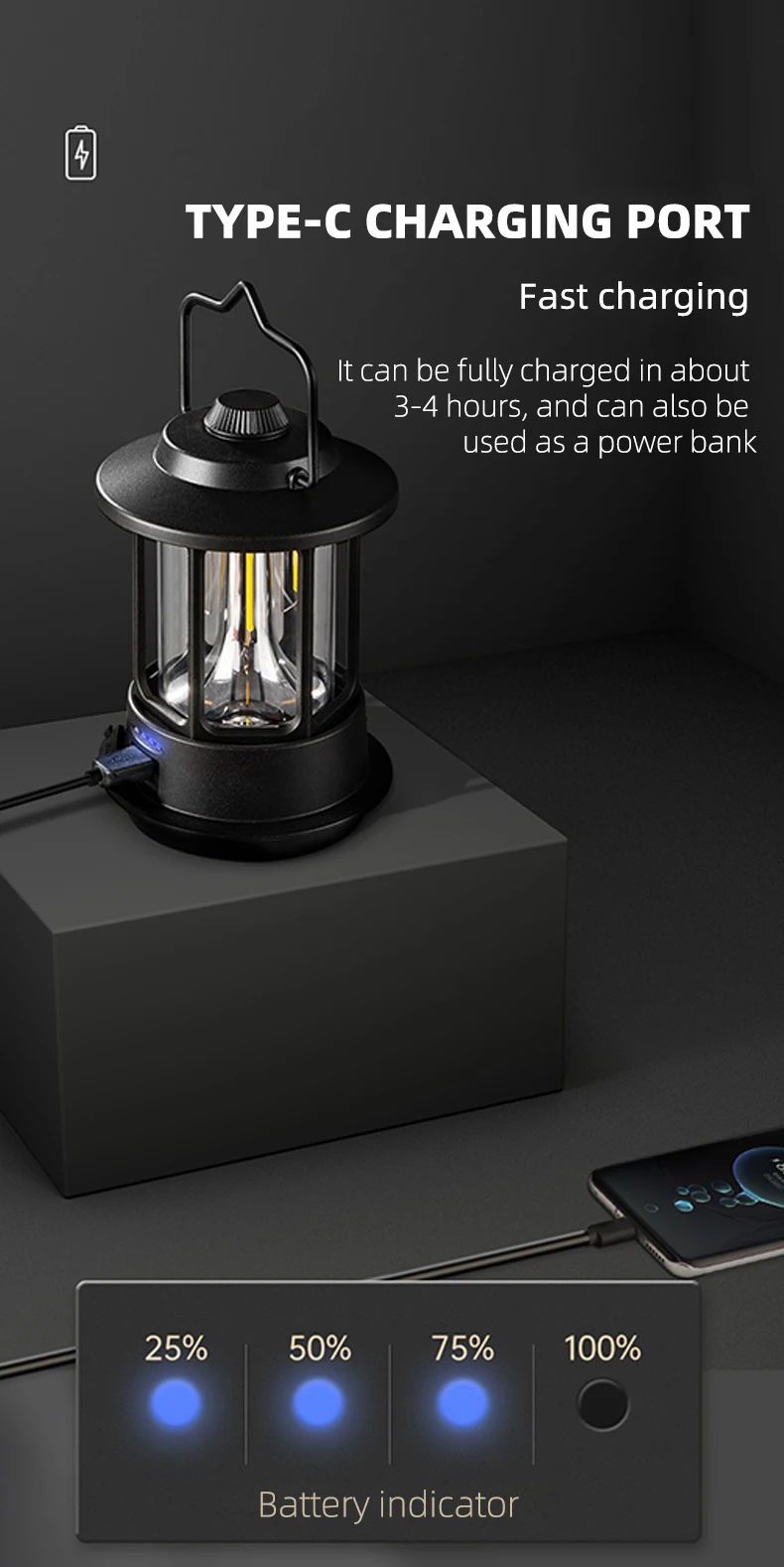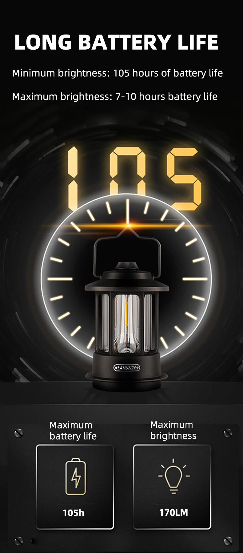 • Rechargeable Battery :No need to worry about replacing batteries. Simply recharge the lantern and use it again and again.