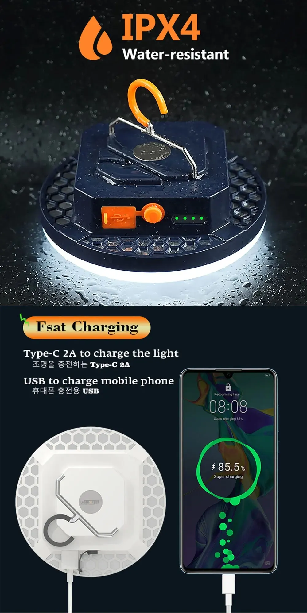 6. Charging method: USB+Type-C 2A dual interface, compatible with a variety of charging methods, can be used for emergency charging of mobile phones or other devices, fast charging, and strong practicability.