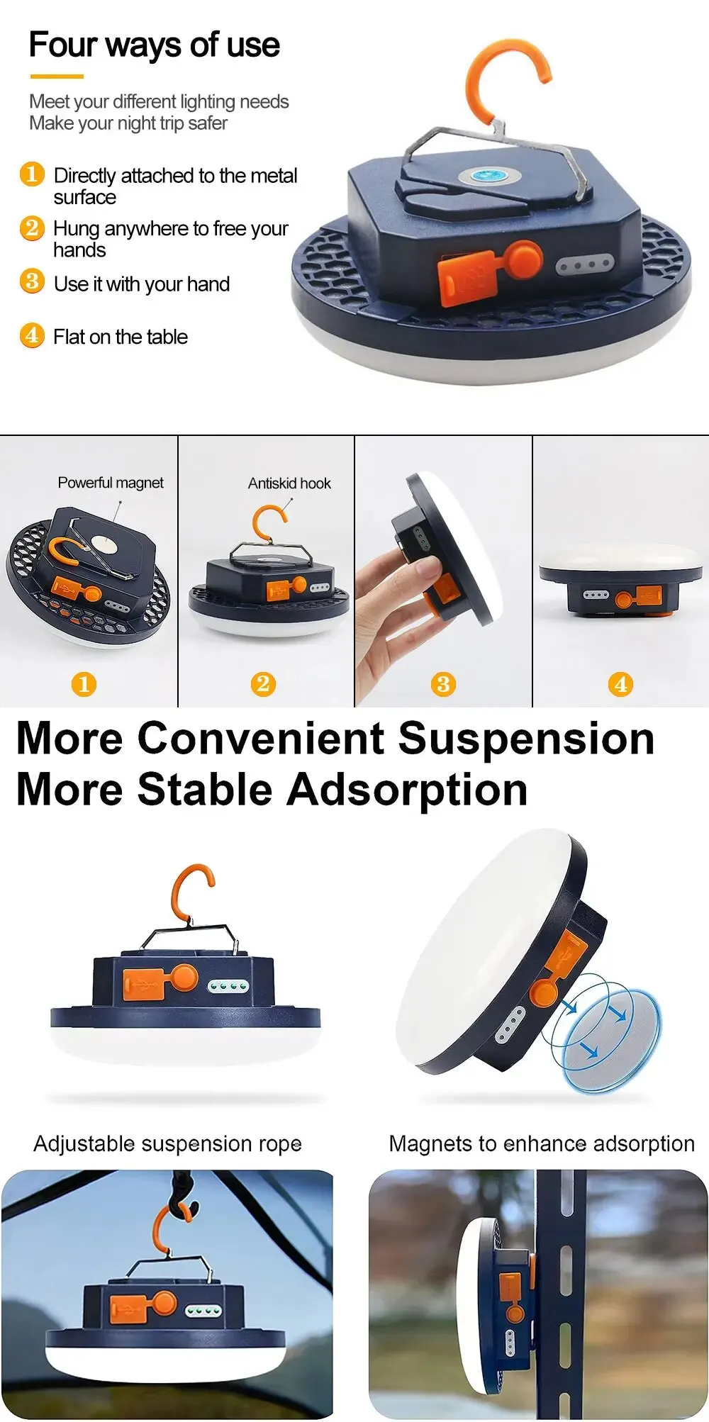 9. Applicable to: can be used as camping lights, fishing lights, hunting lights, travel lights, tent lights, emergency lights, exploration lights, auto repair lights, stall lights, etc., so that your outdoor sports and entertainment lighting is guaranteed. Dark again.