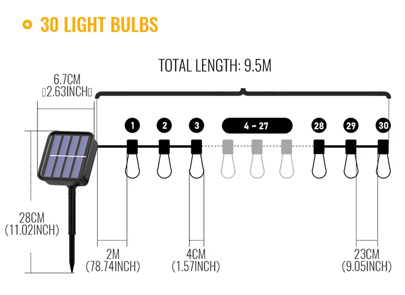 Installation flexibility makes it the best carnival light chain for weddings, birthdays and parties: place the solar panels anywhere with the included stakes and clips. Solar lights do not require sockets, so even spaces far away from buildings can be well lit. The loops on each bulb use hooks or wires-connect all bulbs to create a straight look, or just some loops for a fan-shaped look.