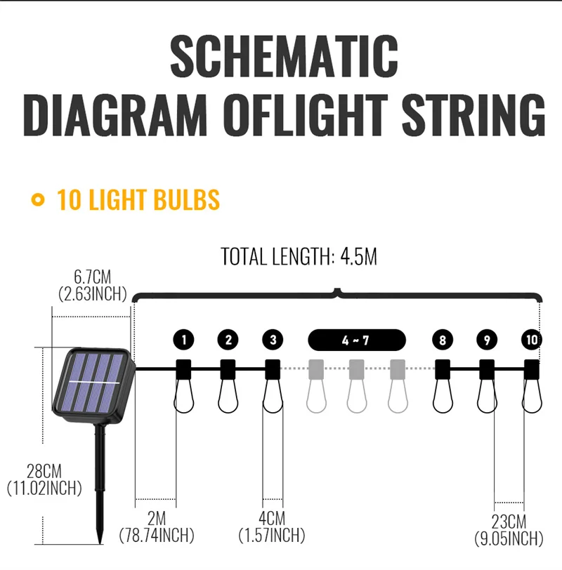LED Solar Outdoor String Lights Specs:String includes 10LED 20LED or 20LED lights and detachable solar panel with on/off switch located on the back. LED bulbs last 20,000 hours and solar panel is rated at 1,000 charge lifespan (can last approximately 2.5 years). Direct sunlight is best for full charge, though you can get some use from charging in indirect light.