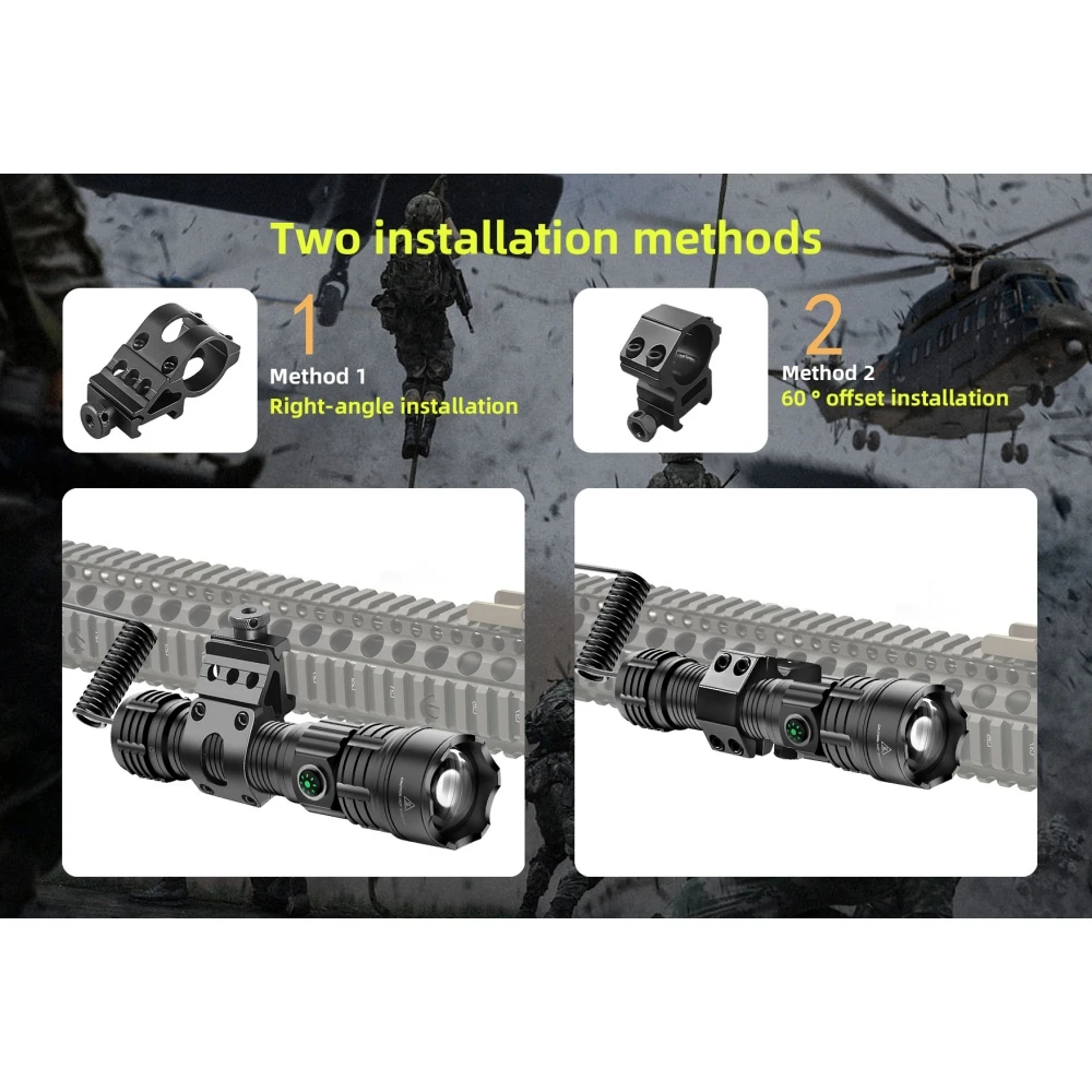 Remote Switch:2 switches-one for button switch, press to turn on the light and second press to turn off the flashlight; one for pressure switch, press all the time to light on and release to light off. Dual-switch tail cap which allows for easy single-hand.