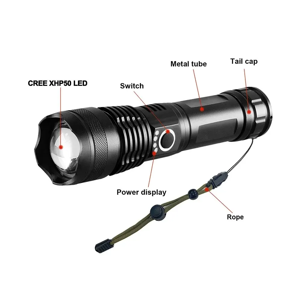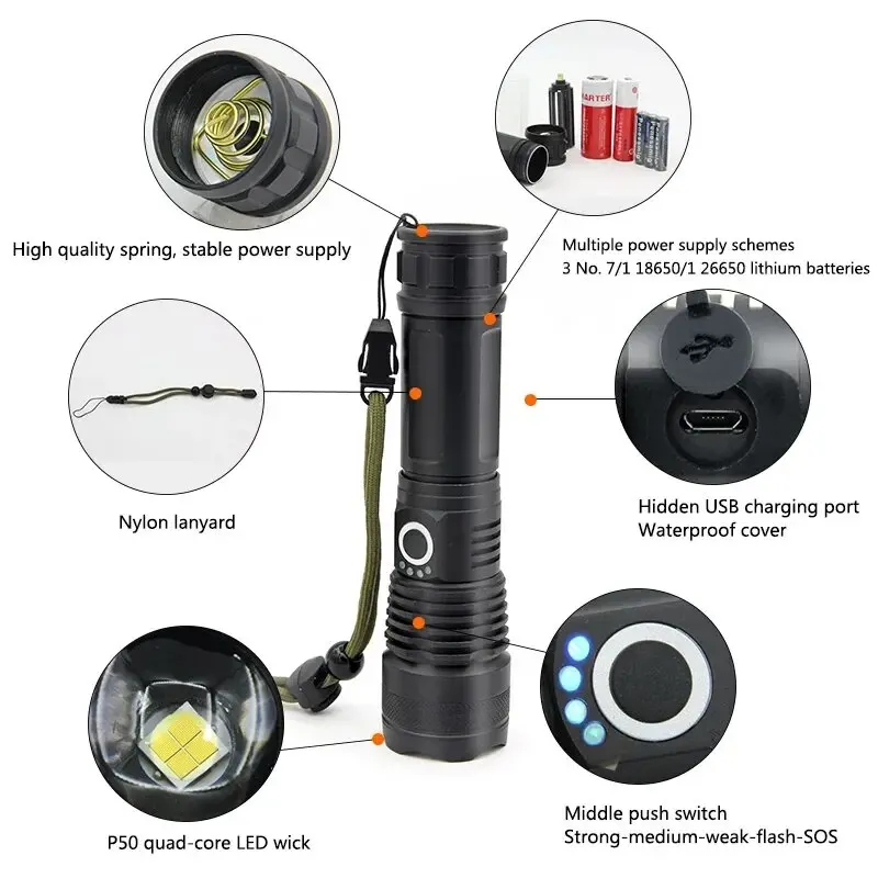 Telescopic Zoom Torch Powerful P50 Lamp Bead LED Flashlight Lantern 5 Lighting Mode USB Rechargeable Camping Emergency Light