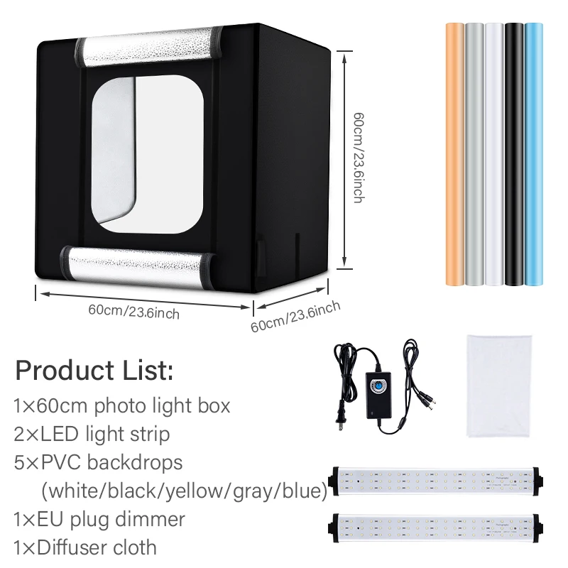 Attention : the size of them all is 60cm,but the photo box 1 was lightweight and the material of the backdrop was cloth ,as for the photo box 2 ,it was with high quality and the material of the backdrop was PVC